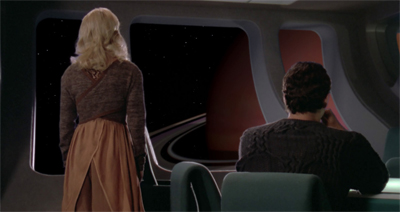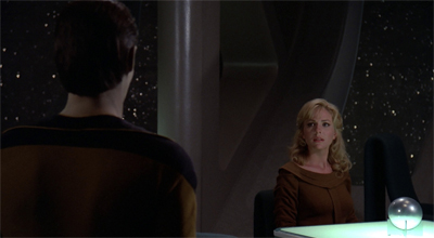 Marina Sirtis’ performance doesn’t help. The scripting doesn’t do Levar Burton or Spiner any favours, but Sirtis is terrible when asked to develop Troi as a regular person. To be fair to Sirtis, she does the whole “vaguely mystical crewmember” and “professional member of the senior staff” stuff well, and has great chemistry with Jonathan Frakes. However, Troi and Crusher remain the most nebulously defined players in the ensemble. McFadden is typically given stronger material (Sub Rosa notwithstanding), but she’s given it more rarely.