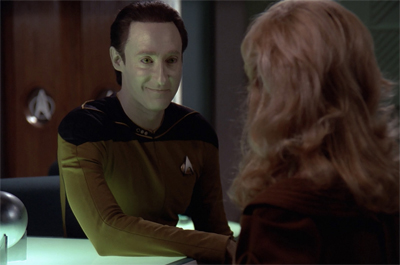 However, Sirtis has difficulty making Troi seem like an actual person. The whole bit where she stifles a laugh and has to excuse herself was never going to be comedic gold, but Sirtis manages to make the whole thing feel particularly staged and particularly cringe-inducing. Burton’s dialogue isn’t that much better, but his comedic timing is stronger, and Spiner is clearly making an effort.
