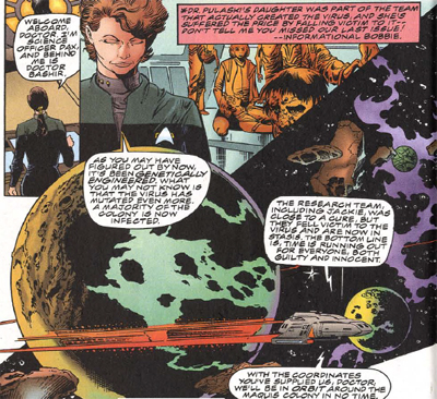 The comic’s plot is pretty standard fare. The Maquis have been designing a biological weapon. As these things tend to do in science-fiction, the biological agent goes horribly wrong – it’s accidentally unleashed and begins infecting the people who designed it. It ultimately spreads to the station, where it infects Kira and Jake Sisko, to generate some stakes. At this point, the plot should seem fairly familiar. Most Star Trek shows like to do “virus infects the ship or station” early in their runs. Deep Space Nine had Babel, which also motivated Sisko by putting Jake at risk.