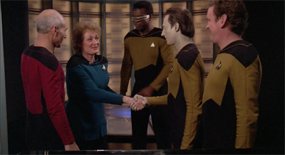 Don’t worry, Picard is quick to put a downer on that. “At least Doctor Kingsley’s vision of it,” he sarcastically remarks. Stupid scientists! Doing research and stuff! How dare they! It takes a while for Pulaski to really learn this (and she does through a combination of stupidity, recklessness and naivity – so, em… yay for positive portrayals of scientists!), but she eventually comes around to it.