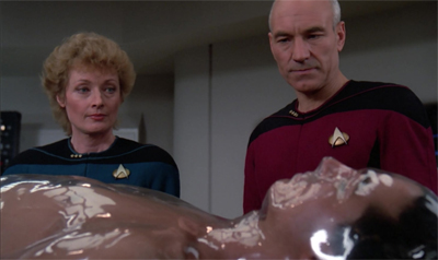 (Maybe this would be less of a problem later in the season. The Measure of Man features Pulaski playing poker with the main staff, and it’s not too hard to imagine her as part of the gang at that point. However, Unnatural Selection is built around ho she’s an unknown quantity to Picard, so trying to argue she gets along fine with everybody else seems a little counter-intuitive, particularly when we’ve seen little evidence of her getting along with anybody by Data and Geordi.)