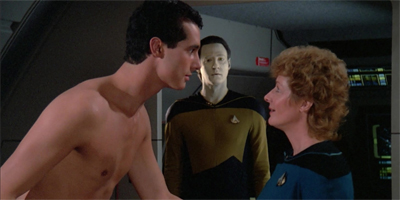 While it’s nice to have a hint of conflict among the ensemble, Unnatural Selection doesn’t work for a variety of reasons. For one thing, there are no sparks to the conflict between Picard and Pulaski, as discussed above. There’s also a sense that this is one of those episodes that is straining to make it seem like everybody is always perfectly reasonable. The script doesn’t show us how wonderful Pulaski is, doesn’t allow her to prove herself. Instead, we’re hammered with testimonies from other characters.