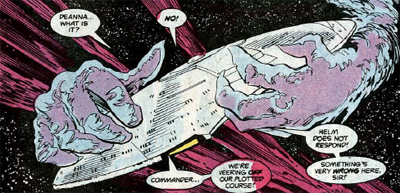 The Enterprise’s mission of exploration is repeatedly stressed across the miniseries. “Doctor, we’re light years further out than anyone’s ever been before!” Picard tells Crusher in the first issue. The last four issues make repeated reference to the Enterprise questing towards the unknown, in search of a new discovery. This is very much in keeping with the set-up of Encounter at Farpoint – the Enterprise extended beyond the edge of Federation influence – but also very much at odds with the subsequent portrayal of the Enterprise as a diplomatic courier or research vessel.