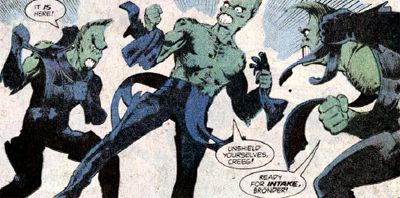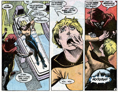 Interestingly, Carlin also seems to foreshadow Deja Q almost two years before it actually aired. You could argue that “depowered Q judged by his fellow continuum members” was an obvious direction to take the plot in the wake of Hide & Q, but it’s still proof that Carlin did have some solidly Star-Trek-kian ideas. (It’s also worth noting that his first issue also uses elements that Star Trek: Voyager would explore with Innocence, even if Star Trek: The Animated Series had already hit on them with The Counter-Clock Incident.)