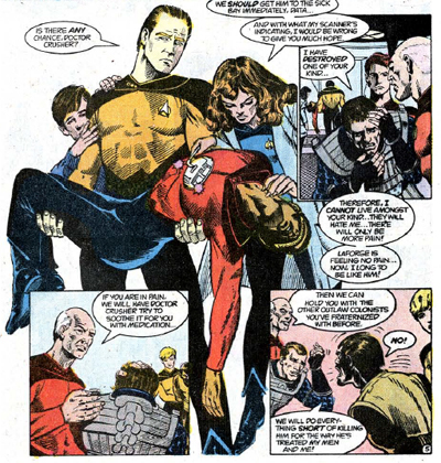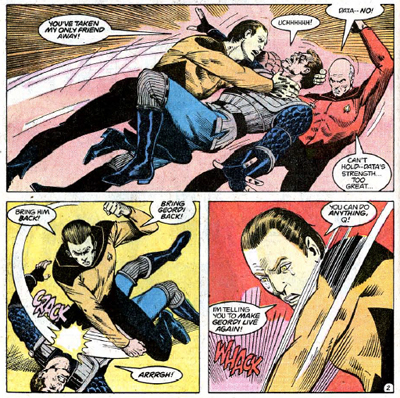 Similarly, Data seems to have been a tough voice for Carlin to crack. “It’s strange — when the bombs are falling — my adrenal fluid really gets flowing!” he declares in the first issue. “And there’s nothing like the threat of termination to make you really feel alive.” In the fourth issue, after Q appears to murder Geordi, Data flies into a murderous rage, pummeling Q and cradling his friend’s body in a pieta pose. “Geordi is innocent! It’s not fair!”