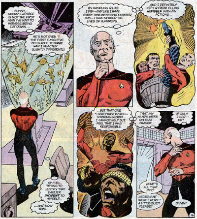 (There are also more generally surreal moments. For example, Deanna’s Betazoid abilities seem to involve a Vulcan-esque mind meld, and Picard and Worf are both fond of exclaiming “bull!” It’s worth noting that Picard is a lot more physical here than he ever was on the show, although that may just be the result of more dynamic comic book storytelling, rather than an error on Carlin’s part.)
