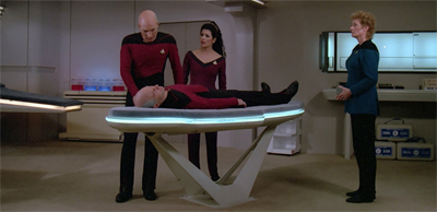 Once he has stunned his counterpart in the shuttle bay, Picard is quite happy to abandon him, not waiting for a medical or security team to show up. There’s a sense that – even after he comes to understand the actions that his duplicate took – Picard still can’t forgive himself for abandoning his ship. There’s a lot of ambiguity in that scene. Given Pulaski doesn’t remain with future!Picard in the shuttlebay, does that mean that he is beyond saving? If so, did Picard kill him? If so, did Picard do it consciously?