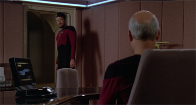 When Riker does show up, Picard seems rather quiet and withdrawn, as if his grand scheme to kick Riker off his ship has been foiled at the last possible moment. He manages a murmur of agreement when Riker selects a course for the Enterprise. Once all that is out of the way, Picard can’t wait to ask the question at the front of his mind. “Any particular reason for this change of heart?” It isn’t quite as blunt as “what are you still doing on my bridge?”, but it’s telling that Picard doesn’t complement Riker on his decision to remain on the ship. The episode ends with Wesley and Deanna smiling. Picard is pointedly not smiling.