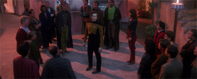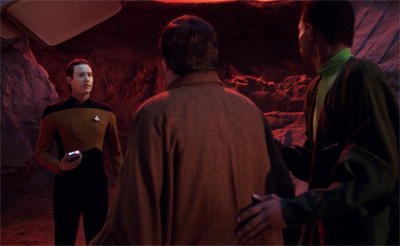 To Snodgrass, and in keeping with her Shane analogy, Data is the perpetual outsider. He exists beyond humanity, looking inwards. And he challenges that view. When Data butts heads with Gosheven’s romanticism, there’s no question that Data is correct; just as he was correct when he resisted Maddox’s arrogance in The Measure of a Man. Data is an objective observer of humanity, somebody with a more rational perspective. His innocence and optimism provides the perfect vehicle to explore the darker side of Roddenberry’s utopianism, by playing it against Data’s objective outlook.