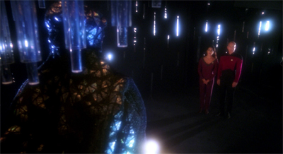 One suspects that the design of the Sheliak, right down to the set design for their bridge area, was driven by these production concerns. The bridge is a black space with some reflective material on the walls, while the costume for the Sheliak appears to be a black duvet cover thrown over a performer – like a more low tech version of Armus from Skin of Evil. It’s something that probably shouldn’t work as well as it does, especially in high definition. Cliff Bole does a wonderful job with the resource and time available.