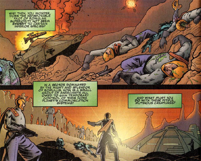 It’s a very slim story, running twenty of the issue’s thirty pages. And, yet, there are some intriguing ideas suggested. For one thing, writer Paul Jenkins manages a rather impressive play on the “Romulans as space!Romans” schtick by giving us a glimpse at what life on the Romulan frontier must be like – subjugating alien races and bringing rogue planets to heel for the greater good of the Romulan Star Empire.