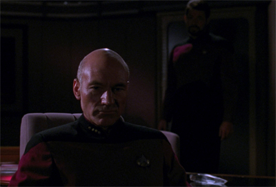 The difference with Booby Trap is that the script is less interested in the high-concept mystery-of-the-week than it is with all the character stuff that flows from that. The snare that has trapped the Enterprise is reduced to pseudo-logical techno-babble, but the episode never seems too engaged with the mechanics of the trap. It drops the right buzzwords (“radiation” and “lethal exposure” mostly) to ensure that we know the stakes, but it’s honest enough to accept that an episode about how Geordi saved the ship by “[tech]ing the [tech]” is not going to be compelling or engaging in its own right.