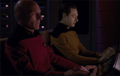 It’s not a fatal flaw. After all, Picard’s interest in “seat of your pants” technology is foreshadowed in a conversation with Riker a few minute earlier. It just feels a little inorganic. It feels like something that might have been smoothed over a bit better had the production team had a bit more time to figure out what they wanted to do with the episode. The show begins and ends as Picard-centric episode, but the middle is solidly focused on Geordi. This isn’t a simple split between a-plot and b-plot; this is the same episode plot, it’s just driven by two different characters at different points. It’s a little disconcerting.