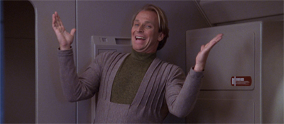 Bernsen’s delivery involves lots of head movement and grinning, and a decidedly exaggerated accent – as well some very bizarre intonation and pauses. “Actually, I was the one who got you kicked out,” he confesses, with the same sort of delivery that Nicholson used for “I’m glad you’re dead.” Next he offers, “You know, you’re incorrigible, Q. A lost cause. I can’t go to a single solar system without having to apologise for you, and I’m tired of it.” There’s the same sort of snap mood change at the end of a whimsical delivery that Nicholson is fond of using.