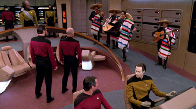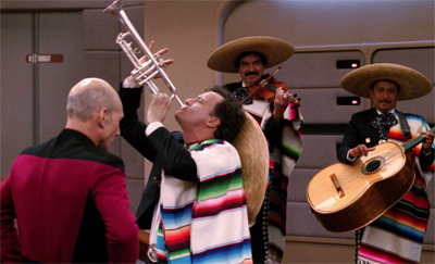 In a way, Bersen’s delivery and style is part of the charm of Déjà Q. It’s an episode that could easily become a little too dreary or self-important, so it’s nice to have these wonderfully exaggerated moments. Any episode that opens with Q appearing naked on Picard’s bridge and closes with a visit from a space!mariachi band is worth a look at least. Using these more bizarre and outlandish elements to help off-set some of the franchise’s occasionally heavy-handed philosophising is an inspired decision that pays off.