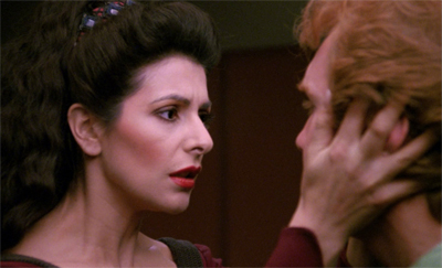 Then again, we get a sense of why the earlier seasons of the show could never delve into the Betazoid culture or mindset. In order to generate drama in a story involving a mind-reader, you need a divide between what people are saying and what they are thinking. The first two seasons of The Next Generation tended to treat the cast as flawless individuals, who could always say what was on their mind without the risk of generating conflict or causing controversy. It would have been very difficult to write a story around “everyone on staff is saying exactly what they’re thinking.” The telepath becomes redundant.
