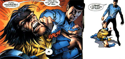Okay, it’s not all bad. There is a certain trashy cheesy charm to all of this. After all, for all that Star Trek and X-Men have rich cultural histories as grand metaphorical commentaries, they are also enjoyable pulpy entertainment. “Did he just… punch my ship?” Kirk muses when Gladiator punches the Enterprise at one point, which is probably the best moment of the entire crossover. Similarly, there’s something quite impressive about Spock putting Wolverine down without breaking a sweat.