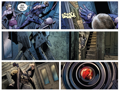 Reinforcing this idea that Age of Ultron is Bendis’ big epic Avengers story, the opening issue starts with a very Bendis-ian street-level set up. A prostitute wanders through an urban wasteland, and is greeted by henchmen holding down the fort. “Hey, we got a honey deliver out here. Eh… about a seven.” It’s a scene that would not have looked out of place in Bendis’ Daredevil or Alias. Indeed, there’s even a reference to “mutant growth hormone” thrown in.