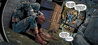 (Then again, Bendis has arguably never been particularly interested in writing generic supervillains. Early on, Peter Parker is rescued from the clutches of Hammerhead and the Owl. Asking what the two criminals did with him, Spider-Man explains, “Drugging me, talking crap, you know…” Sue Richards finishes for him, “Because that’s what they do.” There’s a sense that these sorts of supervillains are all generic and bland, and play into the tropes because that’s what generic and bland supervillains do.)
