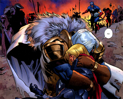 For all that the Serpent lays siege to Earth and marches towards Asgard, he seeks to avenge himself on his brother. For all that Odin is ready to launch a scorched Earth policy, he is trying to protect his son. “Were you a father… were you ever to become a father… maybe you would understand,” Odin tries to explain. “A world is nothing for your son.” Even the conflict between the Red Skull and Captain America is portrayed as a bitter family feud, inherited by Sin and Bucky.