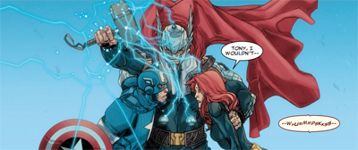 That said, it is worth noting that War Zone is far from entirely sympathetic to the Avengers. For one thing, the team can’t seem to put up a united front against Frank. Wolverine actively and repeatedly assists Frank in avoiding detection and arrest. The Black Widow seems indifferent to his capture. Even Thor decides to share a polite “ale” with Frank in a foreign part of the world rather than arresting him on the spot – satisfying Thor’s sense of “honour.”