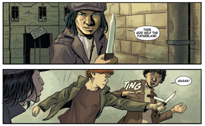Indeed, Schmidt might not share all the political philosophies of the Third Reich, but he serves quite effectively as a metaphorical stand-in for the institution. There’s the same viciousness, the same resentment, the same anger. Like the Nazi party itself, Schmidt has a very long memory, making a point to seek vengeance for wrongs committed years earlier. He hunts down an old drunkard who had abused him in the past, stabbing him brutally. “Nobody hits me and gets away with it.” The idea of faking an assassination attempt on Hitler is made in the first issue, long before Schmidt actually follows through on it.