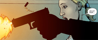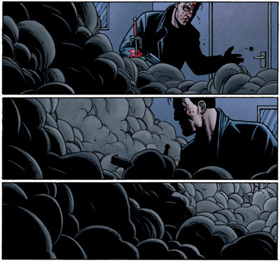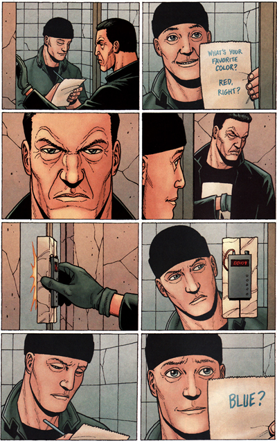 Aaron balances all of this quite well, lending the book an almost surreal quality – set in a demented cartoon world that is only one or two steps away from our own. Aaron only really probes the limit of this set-up in an early issue that pits Frank Castle against “the Mennonite”, an Amish assassin who rides into town in a horse-and-carriage and tries to commit murder using only the most primitive of technology. It’s precisely the sort of absurdity we expect from Aaron, but it’s the only point where Punisher MAX seems to go a little too far into the realm of the surreal.