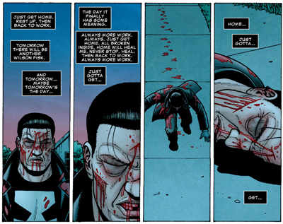 At the same time, Punisher MAX is not nostalgic about its protagonist at all. The book is fairly unambiguous about Frank Castle. Picking up on the threads that Ennis sewed in Born, Aaron makes it clear that Frank Castle was not a man suddenly changed by the loss of his family. He was a terrible husband and a terrible father, and the death of his family was really just an excuse to unleash an anger rooted deep within himself – an opportunity to drop a façade and embrace who he really was.