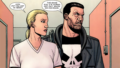 Aaron acknowledges that such a world must run on some comic book tropes and conventions – even if they aren’t as rampant and absurd as they must be in the regular universe. So Aaron takes the more low-key world of Garth Ennis’ Punisher MAX and introduces more and more comic book elements into it. He strips away any semblance of reality and just runs with comic book storytelling logic and characters.