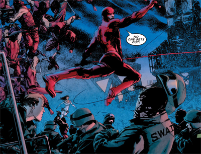 That’s probably what’s most striking about Andy Diggle’s run on Daredevil. It feels like the first time that editorial has really noticed and engaged with the title. It seems like Marvel looked at the critical success of the work done by Brubaker and Bendis, and decided, “Hey, we should probably do an event, or something.” After all, the only thing greater than having a well-written and well-loved book is having a book you can hype to the masses, and can market using Spider-Man or the Punisher or any number of other popular characters.