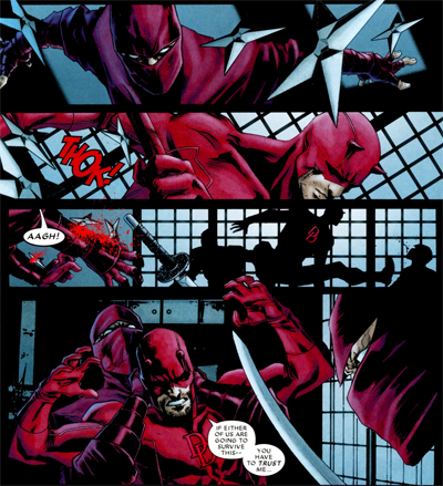 Daredevil is a comic that tends to operate under the radar, appropriately enough. Despite the fact that Bendis and Brubaker were becoming two of Marvel’s most popular and beloved writers while working on Daredevil, the title never explicitly tied into the main Marvel universe continuity. While there may have been references to the shifting status quo, the comic never had to worry about publishing a Civil War tie-in or a Secret Invasion crossover. The comic was self-contained and free to pursue its own narrative threads without being beholden to whatever was happening in the larger books in a given month.