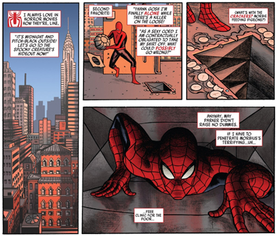 Writer Fred Van Lente’s script is decidedly playful. As seems to be mandatory in any modern vampire story, there’s a dig at Twilight (“is that glitter?”), but the best gag in the script comes in the opening page. Van Lente reveals that Spider-Man and Black Cat keep their masks on during sex, which is both hilarious and unsettling. It serves to immediately undermine Joe Quesada’s puritanical approach to Peter Parker by revealing that Peter apparently has a kinky side, but it also feels like Van Lente playing with the Spider-Man-as-Batman subtext of The-Gauntlet-as-Knightfall.