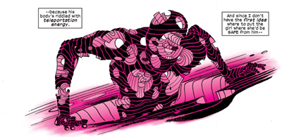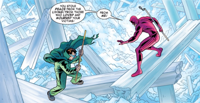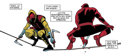 Waid plays with this idea a number of times in the run. For example, at one point it seems like the Spot has dramatically upped his game – that he’s engaging in psychological warfare against Matt Murdock, using his powers in more creative and sinister ways than ever before. Matt describes him as “a c-list teleporter who finally found his ‘A’ game”, reinventing himself as a more violent and brutal adversary. He even gets a nice new character design with lots of black and pointed edges to underscore his reinvention.