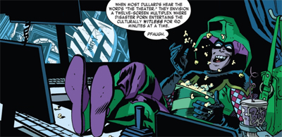 The Jester in particular is treated as a nostalgic character. Trying to defeat Matt Murdock through a series of overly-elaborate and convoluted plots, he offers, “When most dullards hear the words ‘the theatre’, they envision a twelve-screen multiplex where disaster porn entertains the culturally witless for ninety minutes at a time. Pfaugh.” Give Mark Waid’s criticisms of Man of Steel, this feels a little pointed.
