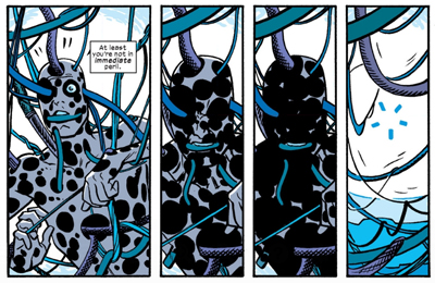 Ultimately, this isn’t the case at all. It turns out that “the Coyote” is a different person altogether, exploiting the powers of the Spot for his own cynical ends. “They thought they could make Spot imaginative… more threatening…!” Of course, the doppelganger is ultimately just a common crook. He is later claimed and devoured by the real Spot, an example of the classic character rejecting any attempt to reimagine him or refine him.