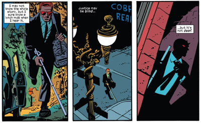 This is a version of Matt Murdock working hard to be the man he used to be, right down to embarking on a journey to San Francisco with a beautiful girlfriend, struggling against “the familiar, paralyzing grip of overwhelming depression.” It’s not a battle that he will necessarily win, but it’s a battle that he is trying to fight. He’ll never be entirely free of insecurity or self-doubt or pride or any of his weaknesses of character, but Waid suggests that Matt doesn’t have to accept these as inevitable, as he seemed to do in earlier stories.