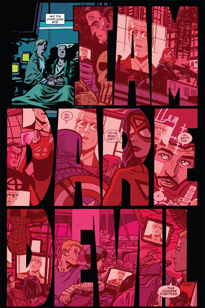 With all this focus on the sixties, it would be tempting to pretend that Waid was glossing over Matt Murdock’s recent history. However, the opposite is true. Waid very clearly intends his run to build on what came before. Brian Michael Bendis’ decision to reveal Matt Murdock’s secret identity to the world hangs over the entire run, from Matt’s cheeky “I’m not Daredevil” cardigan through to his final confession in the witness stand, under oath.