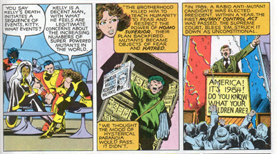In the context of American politics, it’s interesting that Claremont includes another reference to another election year in his grim alternate future history. Kitty reflects on the oppressive power of “the Mutant Control Act of 1988”, placing it squarely at the end of Reagan’s second term. The choice of years is interesting, even if Reagan is never mentioned by name or even alluded to directly. (Indeed, the President appearing in the final pages of the issue looks rather more like Jimmy Carter than Ronald Reagan.)