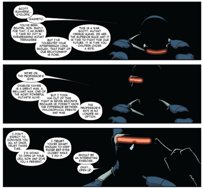 While the Professor condescendingly offers to talk Jean throw some of her problems, Jean remains skeptical. After one assignment, she reflects, “You wanna talk about my ‘ordeal’, Professor? About how a crazy bald man thought it would be a good idea to send five teenagers to investigate a sabretooth tiger attack in Antarctica?” Later, Beast becomes disillusioned when he discovers that Xavier spends social time with terrorists. “You send us out to die at that sociopath’s hand, then you two run off and have high tea together.”