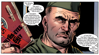 Ultimate Origins paints Nick Fury as the typical Bendis-ian protagonist. He’s a character who really should be a villain. He has every excuse to be bitter and angry, every reason to turn against the world and try to claim a little piece of it as his own. But he doesn’t. “I blamed everyone for what happened,” he reflects at one point. “White people, German people, the President, Captain America, Albert Einstein. You name it, I blamed ’em. And you walk around the world long enough, you suddenly realise things…”