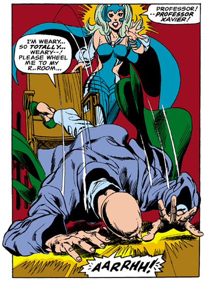 However, Magneto is attempting to recruit young mutants to his cause. On discovering Magneto (in disguise), Angel asks, “Then you’ve been searching out mutants among the tribes here… like a stone-age Professor X?” Of course, it’s all revealed as a ruse – Magneto is creating mutants so as to harness an army – but the script actively invites comparisons between Xavier and Magneto in a way that seems to fit quite comfortably with later developments about both characters.