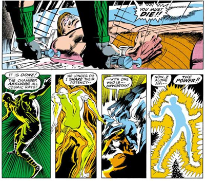 Thomas repeatedly anchors the idea of mutation in “radiation”, very much cementing the X-Men in the rich tradition of Atomic Age science-fiction. In Do or Die, Baby!, the Sentinels deduce that the “mutant-inducing radiation” responsible for the creation of this new species can be found at “the very heart of the raging sun itself!” In contrast, The Coming of Sunfire! makes the implicit connection a lot more explicit. “Shiro’s mother was caught in the Hiroshima blast, you said?” Jean asks about the new mutant superhero. Angel replies, “Yes… that must be why he’s a mutant!”