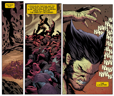This seems to be Aaron’s way of justifying his admittedly gonzo plotting. Sending Wolverine into hell is certainly something a bit novel and a bit different from the character’s usual adventures. When Wolverine arrives in hell, Satan himself welcomes the character as a diverse from the mundane familiarity of his daily routine. “I’ve been doing this job for a very long time,” he confesses. “Seems like forever most days, it really does. Truth be told, there’s not much at all that excites me anymore.” Wolverine is a character who is new to this environment, who offers something a bit different ant unique.