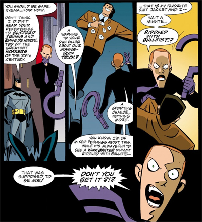 One of the more interesting aspects of The Batman Adventures is the way that the run suggests that the Riddler is really the best mirror for Bruce Wayne among his iconic adversaries. The Riddler is a character defined by his inability to fight his compulsions, even when he knows that those compulsions will not have a happy ending. The Batman Adventures sees the Riddler so incredibly lonely that he winds up staging elaborate riddles and pranks just so that he and Batman might spend time together.