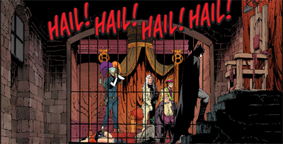 Snyder plays up the homoerotic tension that exists between Batman and the Joker. “I made it with lots of love!” the Joker insists of his perverse last supper. When Bruce storms Arkham Asylum, he discovers that the Joker has forced the guards to dress up as Batman and the Joker so that they might (literally) dance with one another. The wonderful cover to the final issue has the Joker dancing with an empty Batman costume, perhaps elegantly summing up the relationship as the Joker sees it.