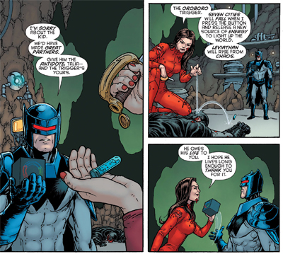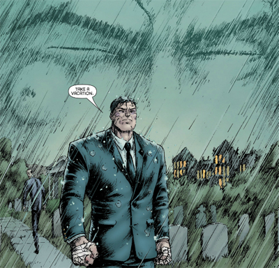 Kathy Kane is not wearing a superhero costume. The implication is that she has grown beyond the “Batwoman” title that she once held while in love with Batman. Having executed Talia, she is quick to thank Bruce for his assistance. “Thanks for helping us lead her into a trap she couldn’t escape.” The obvious implication is that Batman Incorporated was just a pawn in a much larger game. For all Bruce Wayne’s ambitions about changing the world, his dream was nothing be a stalking horse.