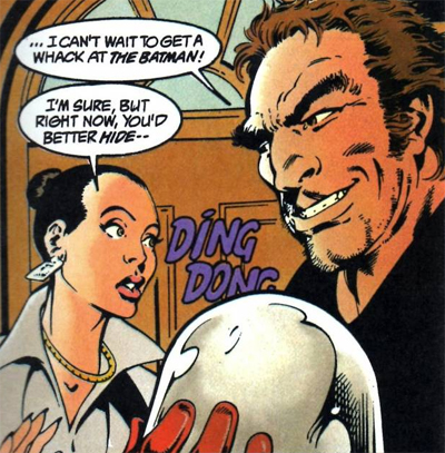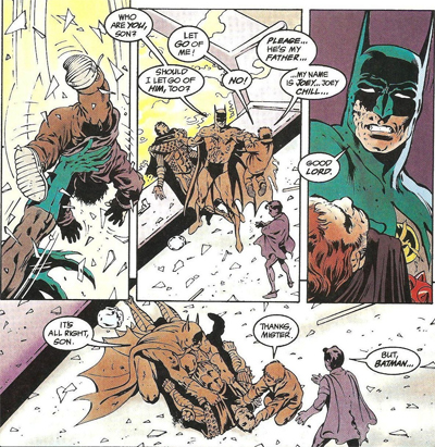 Captured by Joe Chill’s children, Bruce is given a psychedelic drug and forced to watch a replay of a murder conveniently similar to the death of his parents. The idea is to drive Bruce to the bring of despair and to force him to take his own life. It’s nice to know that Joe Chill raised his kids to seek a moral victory instead of one of those “just shoot him in the head” victories. Because those are so cheap. Anyway, in case the reader doesn’t get how grim and oppressive this is, we’re helpfully informed, “‘Survivors guilt’ has taken its toll on survivors of concentration camps and disasters, making them doubt their right to live while they watched their loved ones die.”
