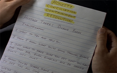 However, this isn’t merely Mulder’s gift for psychological profiling shining through – this is more than simply the empathy that allows Mulder to go inside the head of disturbed individuals. Duane Barry suggests that Mulder is being blinded by his own self-interest, by his own desire for answers and his own sense of guilt over the abduction of Samantha. There are points where Mulder almost seems to forget about the hostages, so eager is he for answers.