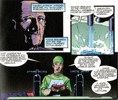 It’s worth pausing to note that Petrucha and Adlard are also quite familiar with the format of The X-Files. Although they only have twenty-odd pages of story, they are sure to follow the expected flow of an episode. Both Not To Be Opened Until X-Mas and A Dismembrance of Things Past open with a scene that could function as a cold open, distant from Mulder and Scully. Both also make sure to include a Scully autopsy sequence, because it’s just not The X-Files without a Scully autopsy sequence.