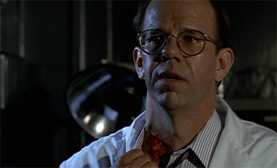 Still, F. Emasculata stands out as one of the rare examples of a sinister conspiracy conducted by a private corporation within The X-Files. When Doctor Osbourne refers to “the company” in nebulous and abstract terms, it seems almost like The X-Files is evoking Alien – another narrative about a sinister corporation seeking to harness a terrifying biological organism for their own sinister purpose. (The way that the disease “bursts” out of its victim also evokes the iconic film series.)